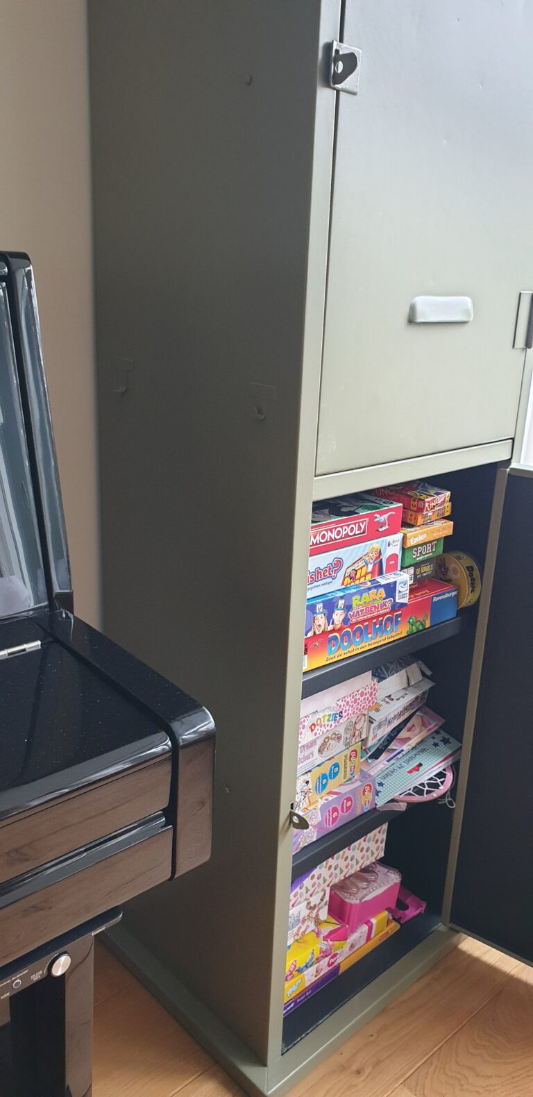 In de woonkamer staat een kleine kast met wat spelletjes en knutselspullen. De grote kast die we eerst hadden heeft plaats moeten maken voor een piano (Roos zit op pianoles).
